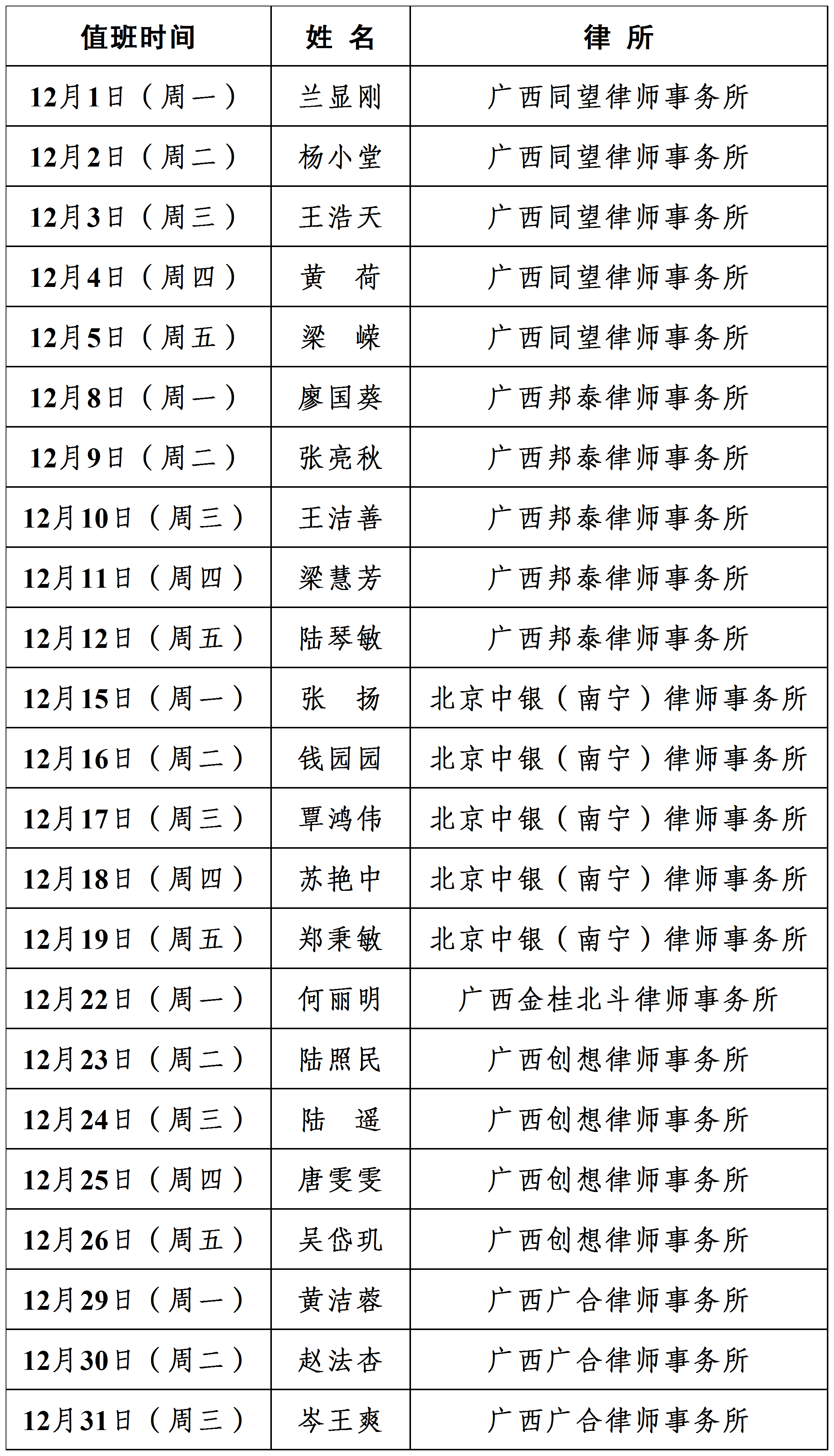 2025年(nian)12月廣(guang)西律師協會公(gōng)益灋(fa)律服務(wu)中(zhong)心志(zhì)願律師值班安(an)排(pai)表
